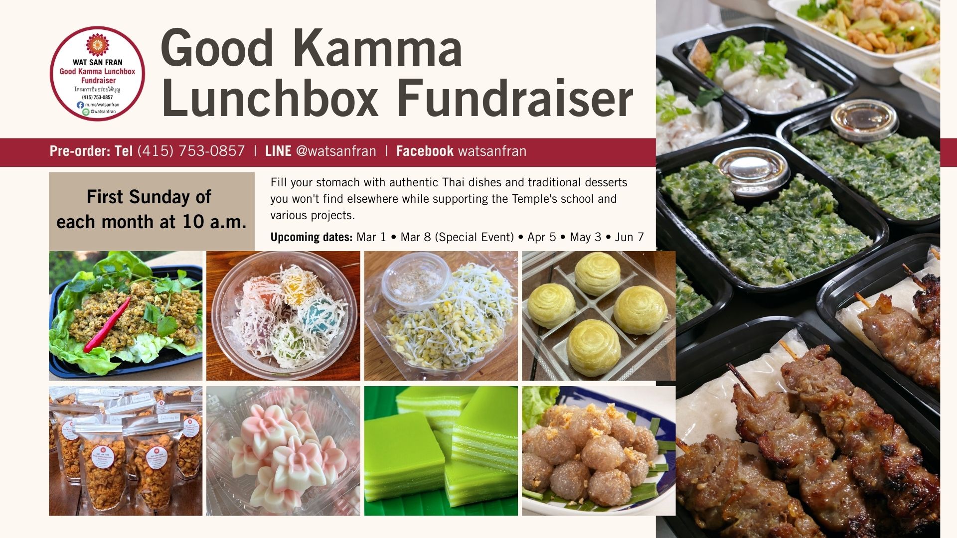 We host the Good Kamma Lunchbox Fundraiser (First Sunday of each month) to raise support for the Temple and the Wat San Fran School. Stop by and fill your heart with good kamma as you fill your stomach with delectable Thai food and traditional desserts you won’t find elsewhere in San Francisco. Anumodana with everyone who made our past fundraisers a success!