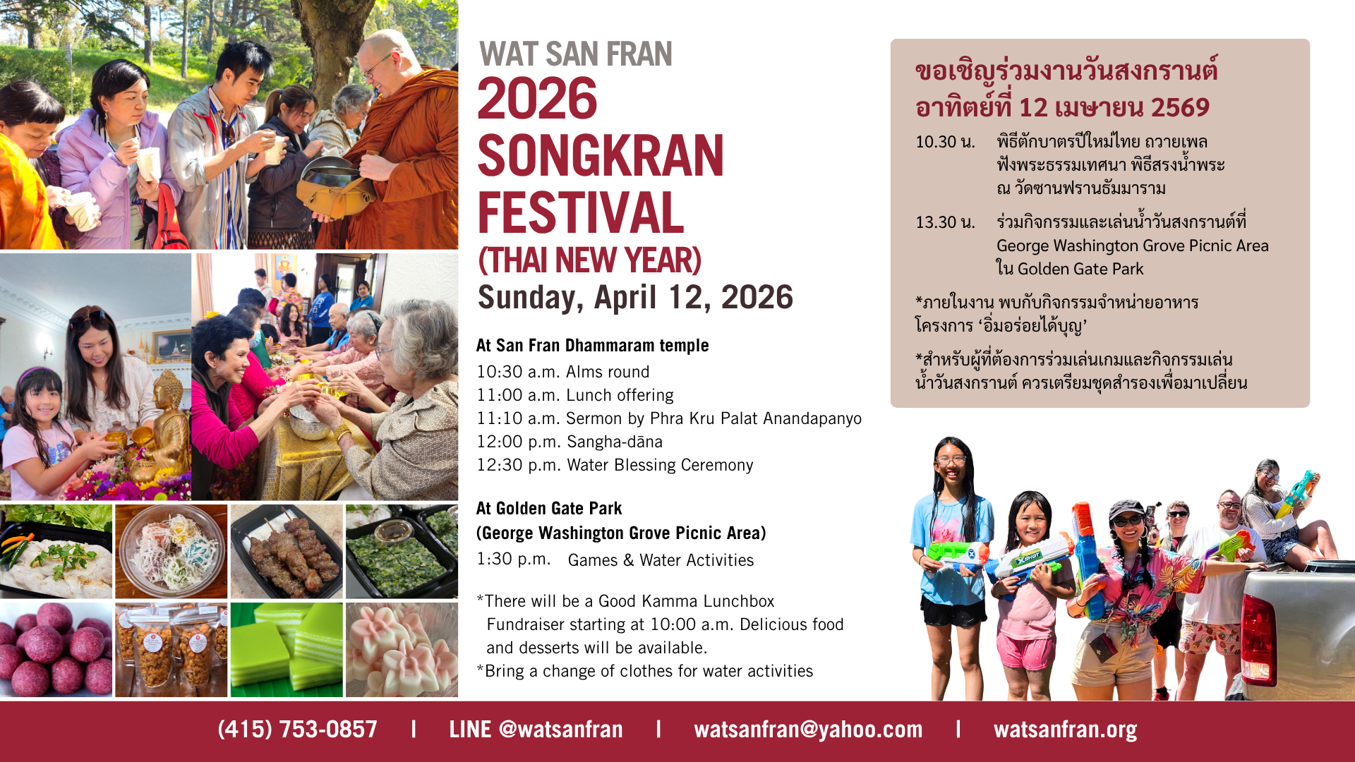 Start off the Thai New Year (Songkran) at San Fran Dhammaram Temple on Sunday, April 12, 2025 by giving alms and participating in the traditional watering ritual in which water is poured on the Buddha’s relics, monks, nuns, and elders as a sign of respect and to ask for good luck and prosperity.